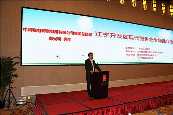 中国南京第23届金秋经贸洽谈会(简称金洽会)已成为江苏省政府举办的最具综合性、代表性的高层次招商推介活动之一,也是我国知名的、重要的区域性大型展会活动之一,在海内外有着广泛的影响。据统计,南京60%以上的三资企业,80%以上的合同外资金额,90%以上的超千万美元的外资项目,都是金洽会直接或间接的成果。中鸿税务集团总经理郑光明先生受邀参加江宁开发区现代服务业推介会暨江宁现代服务业联合会揭牌仪式。作为2013中国·南京金秋经贸洽谈会专场活动之一,此次活动由江宁开发区管委会、南京现代服务业联合会与江宁区投资促进局联合举办。