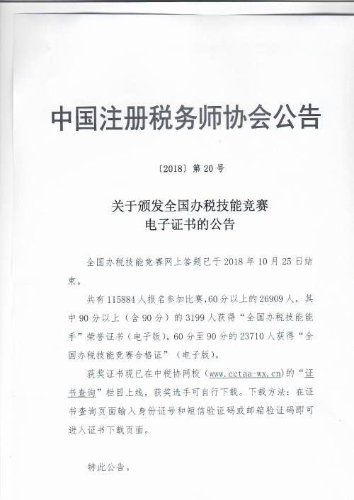 关于颁发全国办税技能竞赛电子证书的公告.doc