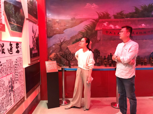 首先来到的是位于张家港市锦丰镇沙洲新城的沙洲县抗日民主政府纪念馆。纪念馆分为中华怒吼、国耻家恨、“江抗”东进、众志成城、浴血奋战、百折不挠、沙洲光复、名录等8个部分,采用文字、照片、影像、模拟现场、雕塑等方式展现了沙洲人民在中国共产党的领导下为保卫家园和祖国领土完整,顽强抵御侵略者的英雄事迹。