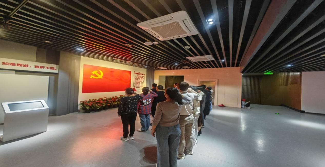 参观结束时,第一党支部书记孔令明同志带领全体党员重温入党誓词。全体党员面对鲜红的党旗,庄严肃立,高高举起右拳,铿锵有力的喊出“我志愿加入中国共产党……”,短短十二句入党誓词,字字千钧,让全体党员再一次重温了入党时的庄严承诺和坚定决心,进一步坚定了理想信念和职责使命。