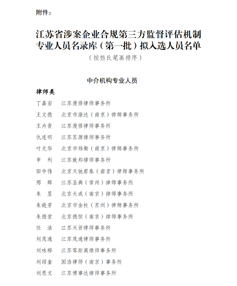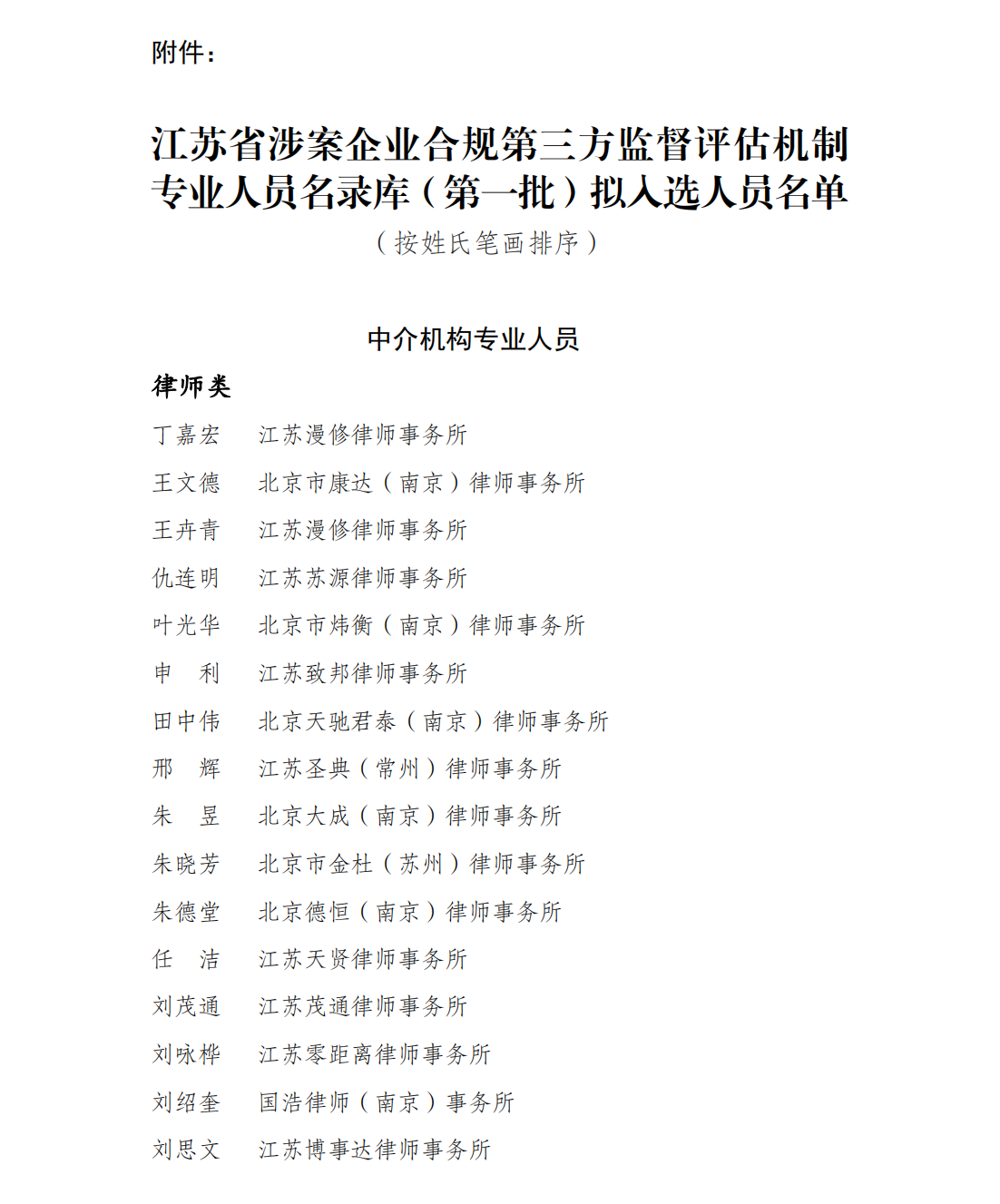 附件:江苏省涉案企业合规第三方监督评估机制专业人员名录库(第一批)拟入选人员名单(按姓氏笔画排序)