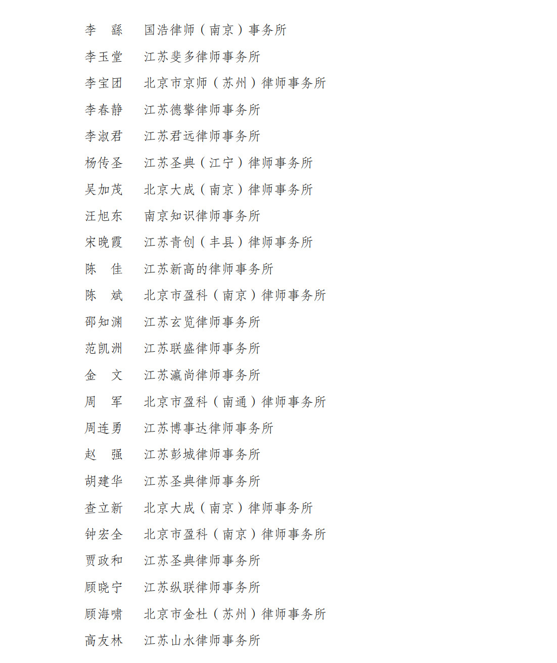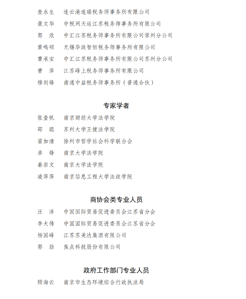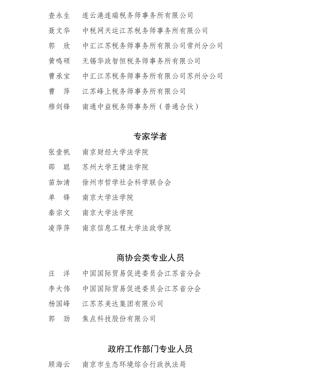 根据《关于公开选任江苏省涉案企业合规第三方监督评估机制专业人员(第一批)的公告》要求,经向社会发布公告、本人申请、单位推荐、材料审核、商请相关部门和各专业协会审核、省第三方机制管委会联络员会议集中研究等选任程序,综合考察报名人员的参与合规工作履历、社会及行业影响力,充分考虑我省涉企合规案件办理情况,确定江苏省涉案企业合规第三方监督评估机制专业人员名录库(第一批)拟入选人员名单共120人。现予以公示。