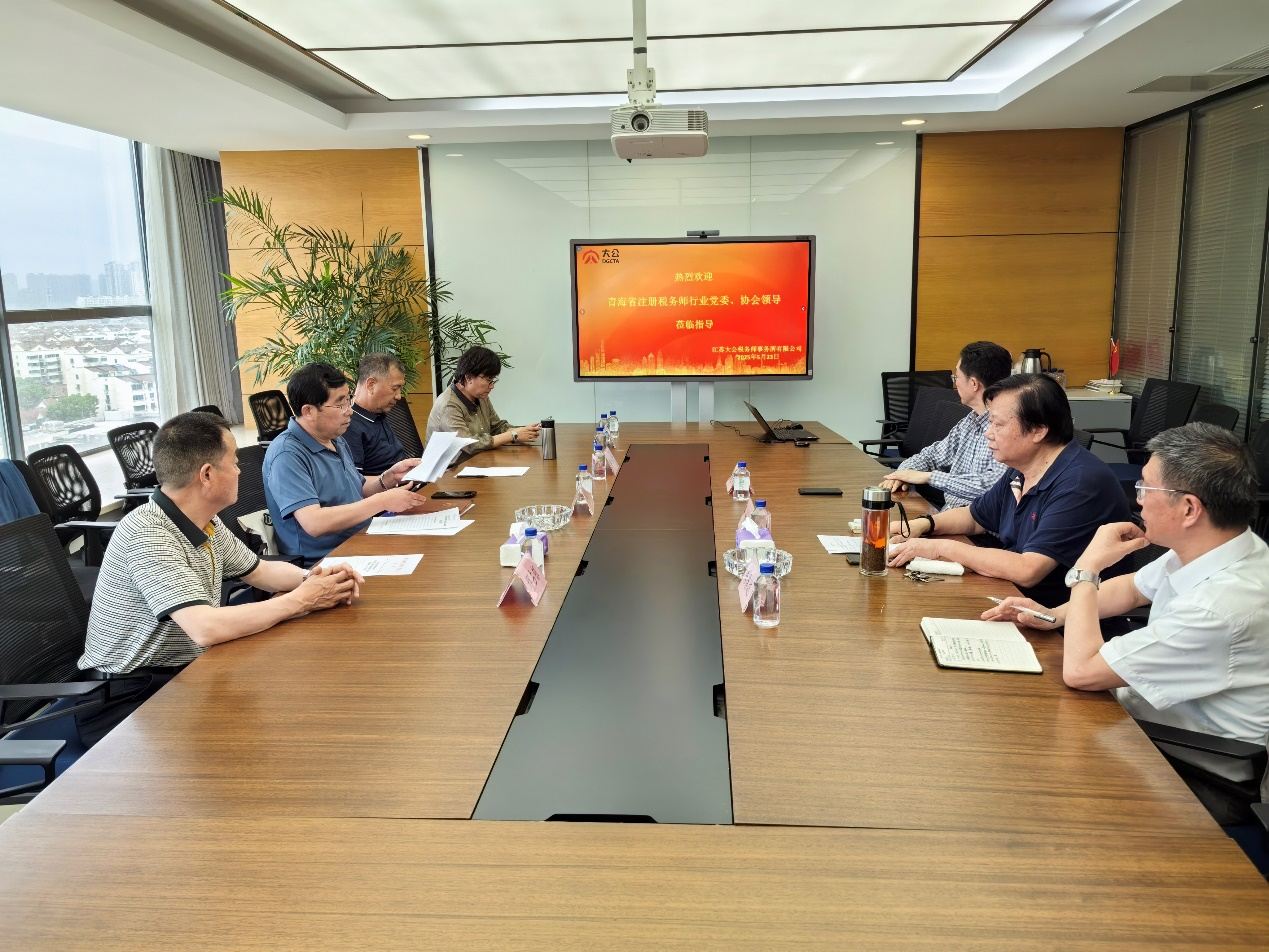 江苏大公税务师事务所有限公司董事长、党支部书记金炳忠同志,对青海省注税行业党委领导来所莅临指导表示热烈欢迎,向青海省注税行业党委、协会领导详细介绍了江苏大公所的党建工作以及单位管理、队伍建设等具体做法,播放了江苏大公所《发挥政治核心作用 促进企业全面发展》党建工作视频。